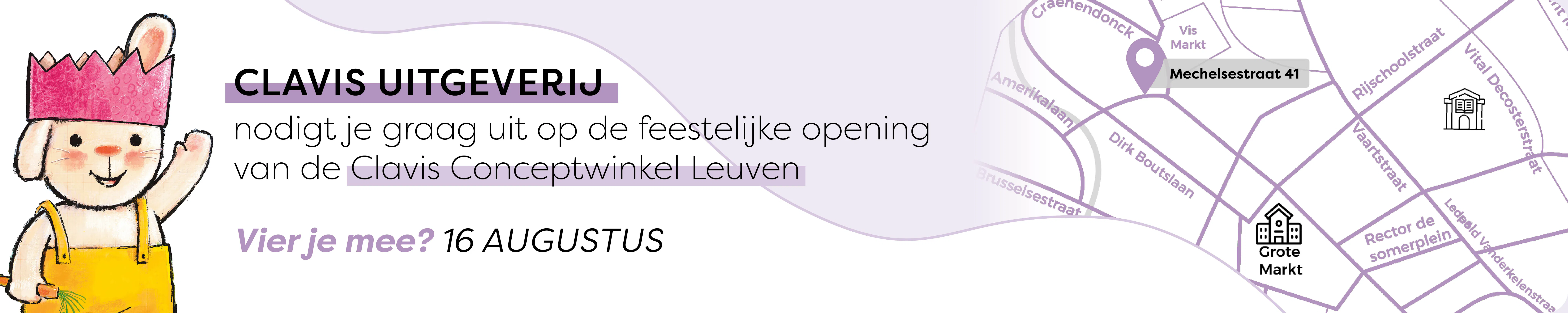 Vrijdag 16 augustus is het zover! De nieuwe Clavis Conceptwinkel in Leuven opent om 10 uur zijn deuren. Kom gerust eens langs: kijk rond in onze prachtige winkel, snuister tussen de boekjes, luister naar zalige verhaaltjes, neem deel aan leuke knutselactiviteiten en ontmoet Rikki en Heksje Mimi!